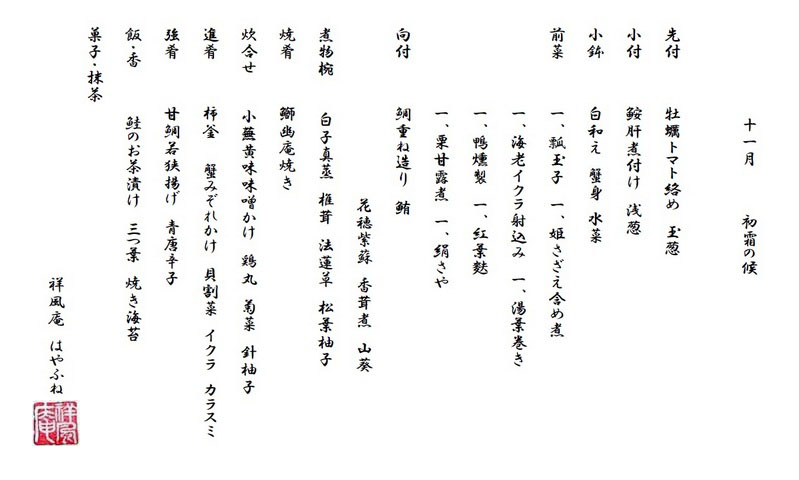 こちらの料理は茶懐石のお料理ではありません。会合の席等の会席料理です。